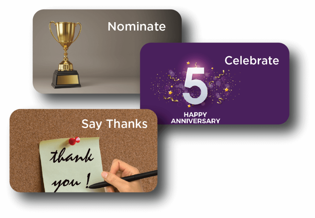 Employees are awarded points for peer recognitions, celebrations, and nominations by managers.