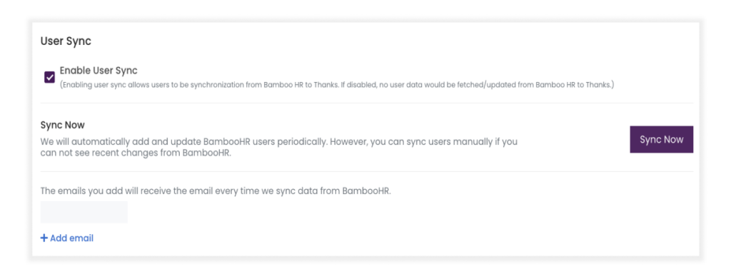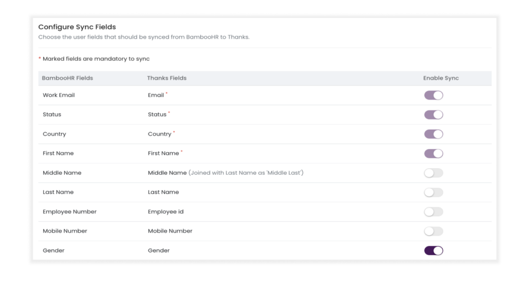 HR admins can now control what data they want to sync. Enable a list of employee information that should sync from the Bamboo HR database to the Thanks platform.